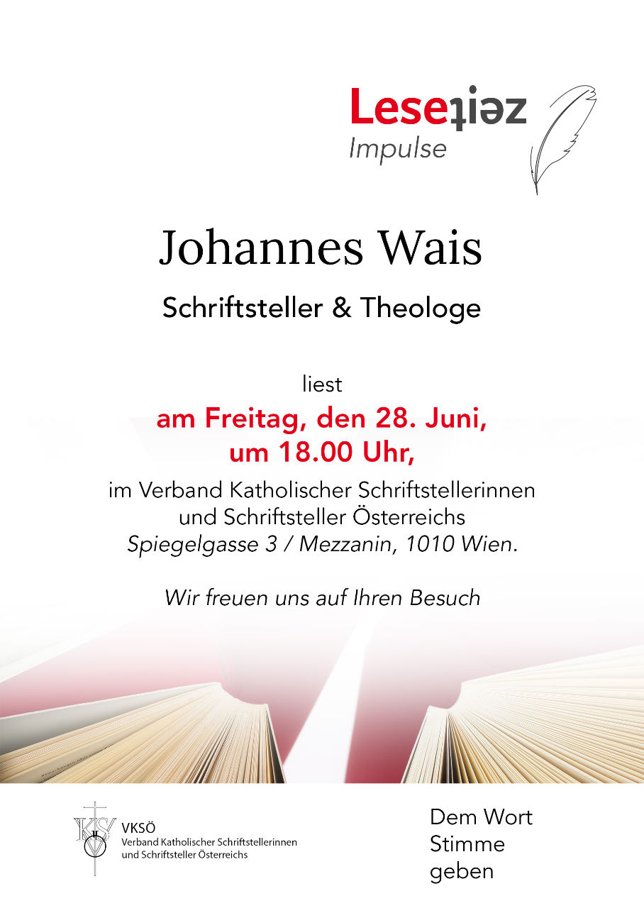 Der Verband Katholischer Schriftstellerinnen und Schriftsteller Österreichs (VKSÖ) gehört zu den ältesten Schriftstellerverbänden Österreichs und hat seinen Sitz mitten im Zentrum Wiens, in der Spiegelgasse 3. Am 28. Juni 2024 trug Johannes Wais im Rahmen einer der monatlich stattfindenden Lesungen des VKSÖ eine Auswahl seiner lyrischen Texte vor und durfte sich dabei über die äußerst positive Resonanz beim Publikum freuen. Am selben Abend waren auch der Schauspieler und Autor Martin Ploderer sowie Marion Wisinger, die Präsidentin des Österreichischen PEN-Clubs, am Wort.